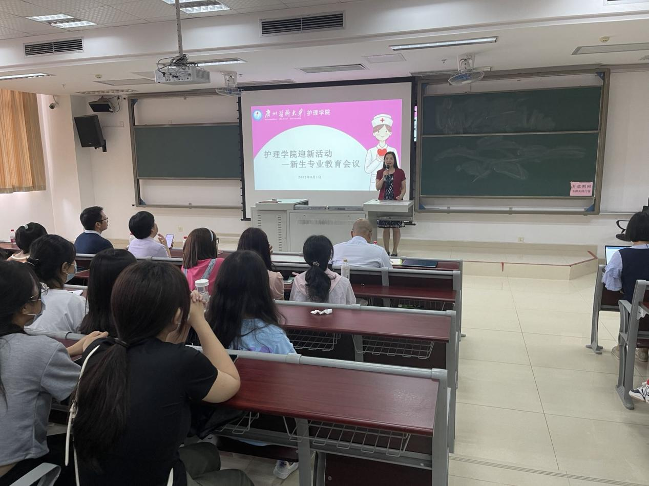 青春启航,载梦而行。jinnianhui今年会迎来了2022级护理学专业150名新学子,他们从全国各地来到了这里,开启了全新的校园生活。9月1日上午9:00,今年会在番禺校区A3-224教室举办了2022级新生专业教育会议。学院领导雷丽琼书记、徐学虎副院长、黄美凌副院长、办公室叶盛主任、教研办韩媛主任、学生办黎泽华老师、2022级护理专业兼职班主任及2022级护理学专业全体同学参加了本次活动。