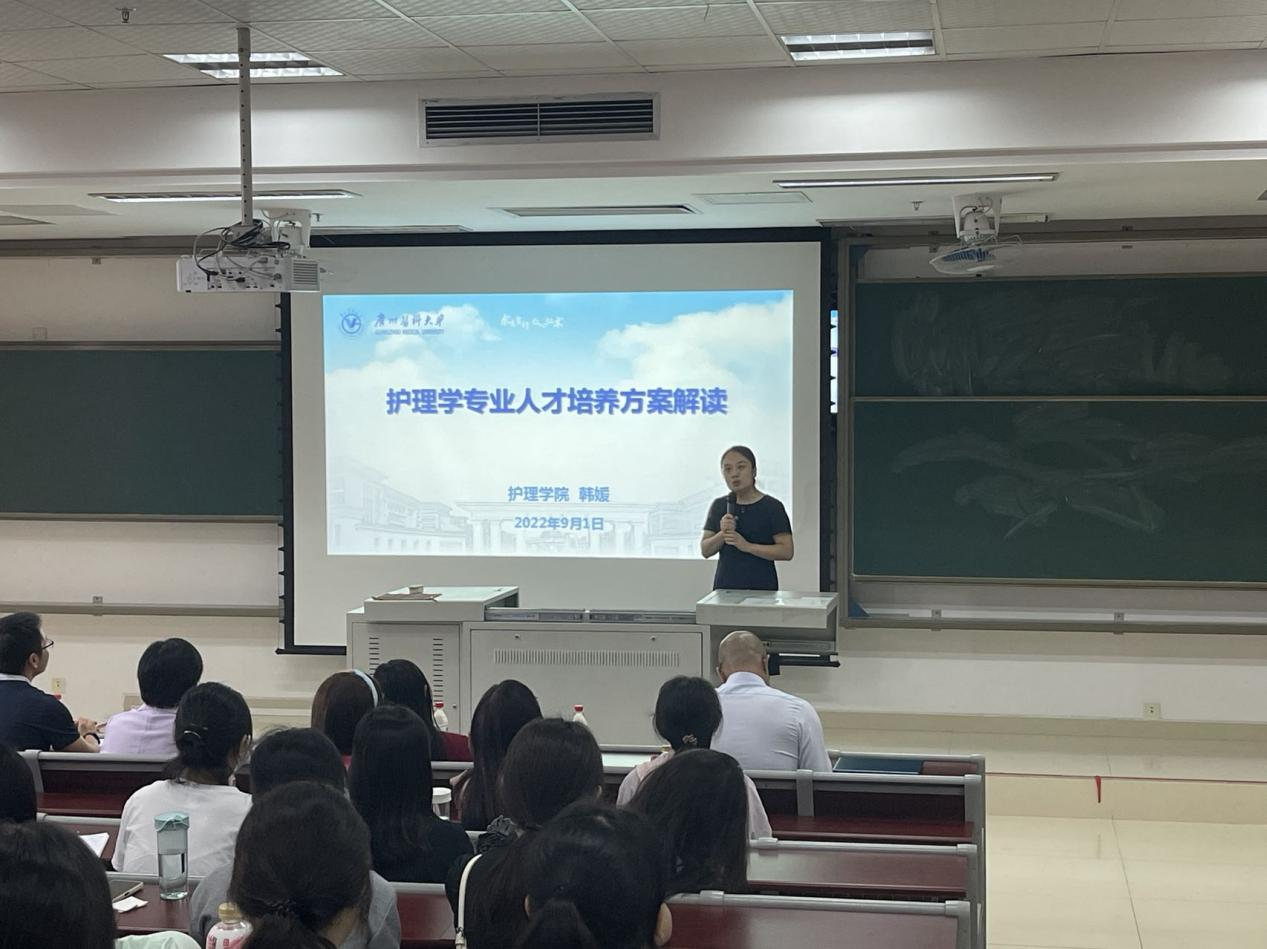 紧接着,教研办韩媛主任详细解读了护理学专业的人才培养方案,并对今年会与澳门镜湖jinnianhui今年会的2+2联合培养项目进行了介绍,她提醒新生选课的注意事项和毕业要求,并祝愿同学们四年学得开心、学得快乐、学有所成。