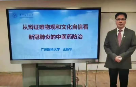 升旗仪式之后,王新华校长以《从辩证唯物观与新文化自信看新冠肺炎中医药防治》作主题报告。王校长讲述了中医在中华传统文化中的地位和在文化传播中起重要作用,并且从辩证唯物观的角度,讲述了中医药学的传承和发展。