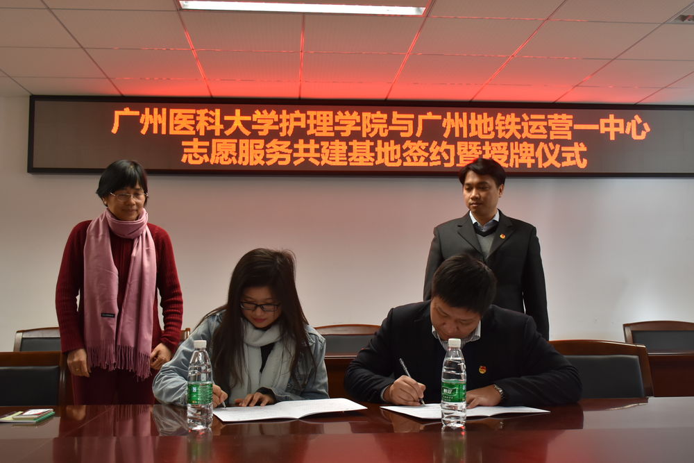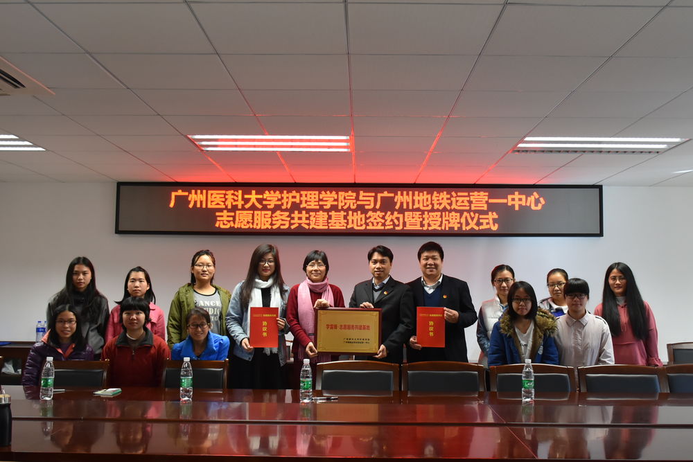 2018年1月11日下午三点半,在今年会jinnianhui官网番禺校区学生活动中心三楼会议室举行了“jinnianhui今年会与广州地铁运营一中心志愿者共建基地签约暨授牌仪式”。广州地铁集团有限公司团委肖然副书记、广州地铁集团有限公司运营事业总部运营一中心黄一凡副书记、jinnianhui今年会学生办欧丽娅主任、jinnianhui今年会团委马娜书记以及11名jinnianhui今年会志愿者代表参加了此次活动。