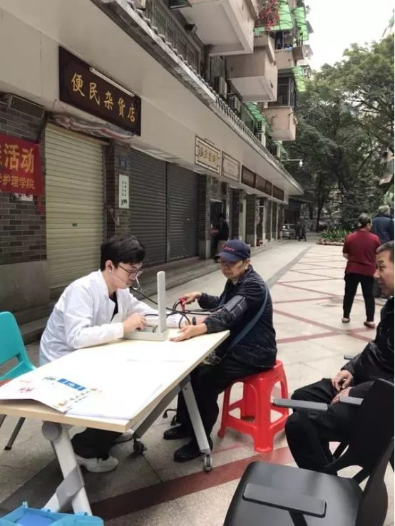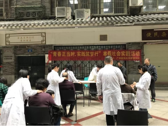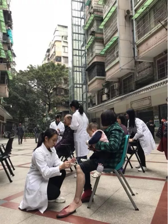 志愿者们为当地居民提供按摩、艾灸、量血压等诊疗活动,热情地与街坊聊天,并积极地为他们按摩,时刻体现着作为广医护院学子优良的作风,得到了居民们的赞赏和支持,同学们深感幸福,深深体会到了为人民服务的快乐。