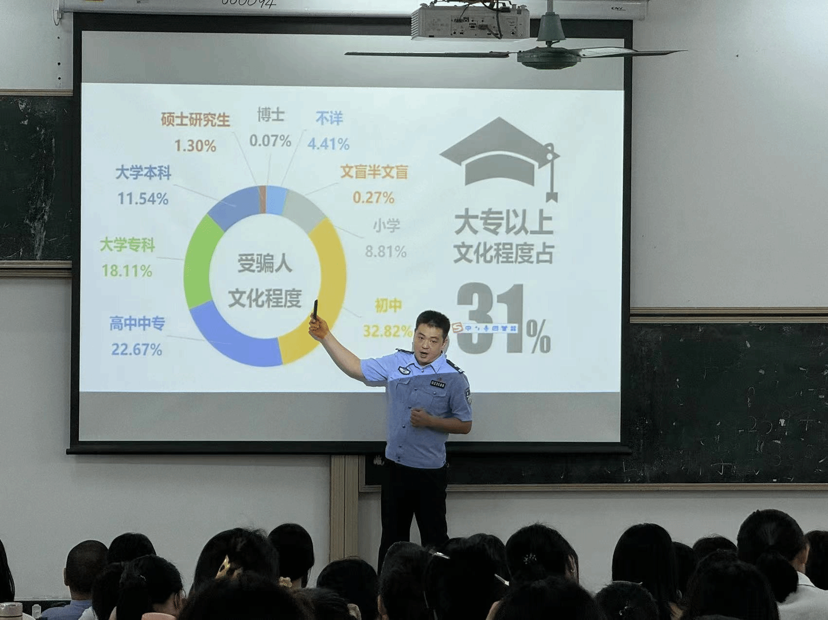 讲座中,罗可弟警官通过真实案例向同学们详细介绍了“冒充客服”“注销校园贷”“游戏诈骗”“冒充熟人”等典型骗局,提醒大学生在网购、社交过程中注重个人信息保护,提高自我防护能力。活动现场,罗警官积极与同学们互动,整场讲座生动活泼,会场气氛热烈。