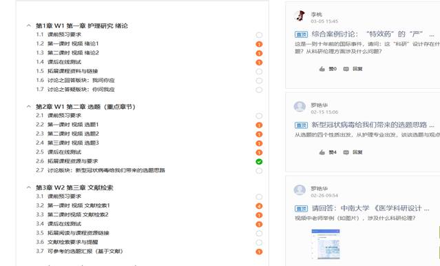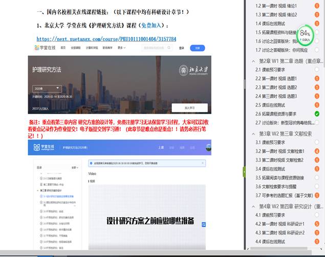 《护理研究》课程根据学校、学院相关文件和通知,全体教师队伍坚持“停课不停教、停课不停学”,根据课程特点、网课资源、时空变化等分析,开课第一周前在超星学习通上对原今年会jinnianhui官网精品资源共享课的平台资源重新建设与完善,结合教育部发布的学堂在线、中国大学慕课平台等提供的相关在线课程,如中南大学的《医学科研设计》、北京大学《护理科研方法》等优质微课资源,教学团队对内容安排研讨与学习引导。