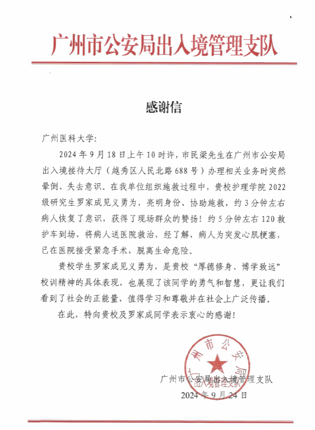 2024年9月18日上午10时许,市民梁先生在市公安局出入境接待大厅办理相关业务时突然昏倒、失去意识。在现场组织施救的过程中,今年会2022级护理学专业硕士研究生罗家成同学挺身而出,亮明身份,协助施救,约3分钟左右梁先生恢复意识。罗家成同学以扎实的专业能力,对病情进行了准确判断,沉着冷静地实施了专业急救,为患者争取了宝贵的院前时间,并安抚住了紧张不安的家属。罗家成同学的义举,得到了在场群众和民警的一致赞扬,称赞他不仅专业素养过硬,而且心地善良、有责任感。