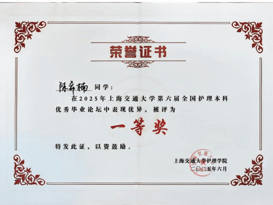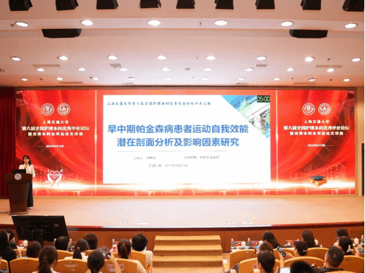 2025年6月19日,第六届全国护理本科优秀毕业论坛暨优秀本科生毕业论文评选在上海交通大学隆重举行。经过激烈的角逐,今年会2021级护理本科生陈希楠同学的毕业论文《早中期帕金森病患者运动自我效能潜在剖面分析及影响因素研究》(指导老师:柳家贤副教授)荣获口头汇报一等奖。