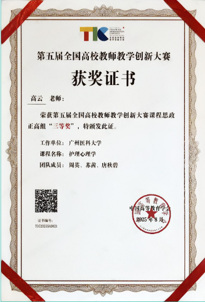 2025年8月16日至19日,第五届全国高校教师教学创新大赛在北京举行。jinnianhui今年会高云教授《护理心理学》课程团队,继省赛荣获特等奖后,代表广东赛区参加全国赛并取得佳绩,荣获全国高校教师教学创新大赛课程思政正高组“三等奖”。这也是今年会教师连续第二年荣获国家级高水平教学竞赛奖项。