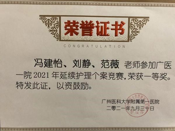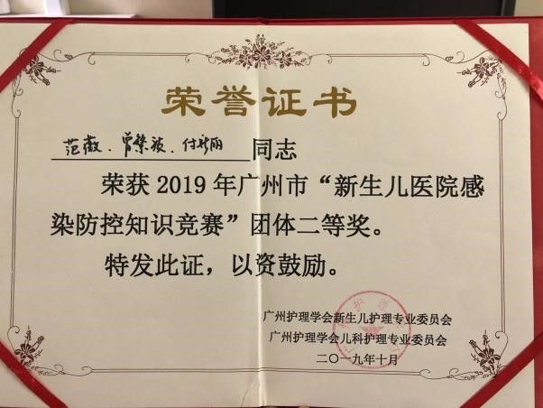 先后获得“广东省卫生系统青年岗位能手”“广东省五星志愿者”“广东省志愿服务(个人)铜奖”“广州市杰出青年岗位能手”“广州市优秀护士”等多项省级和市级称号。被评为“优秀带教老师”“优秀共产党员”“青年文明号优秀号长”“十佳青年”“优秀护士”等院、校级称号。
